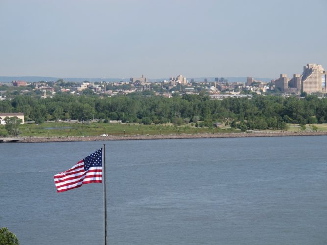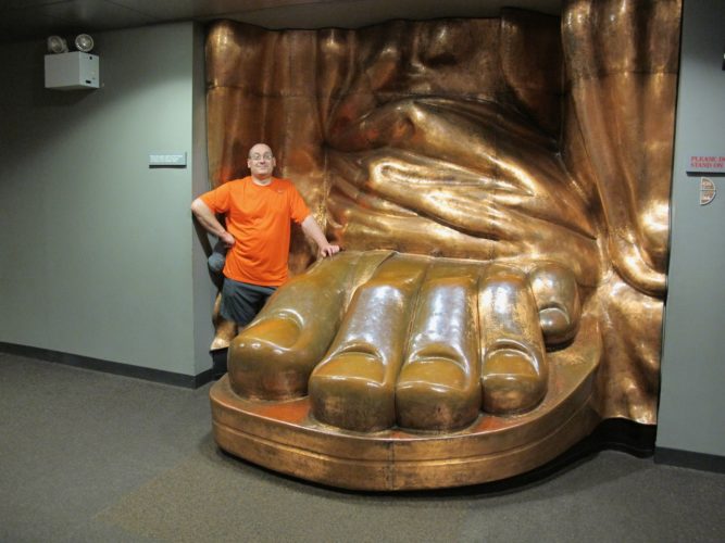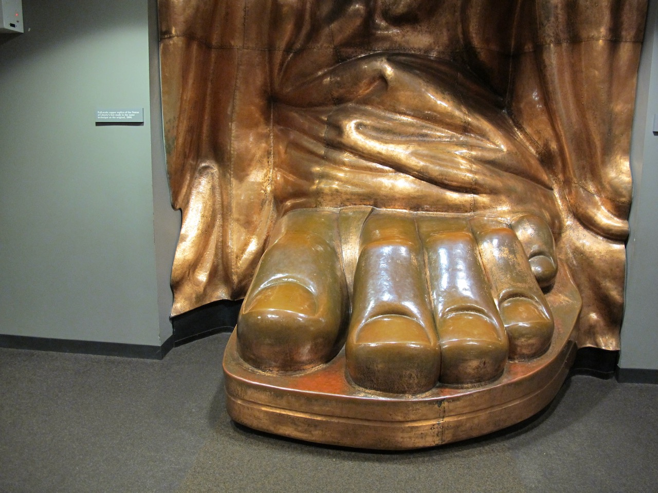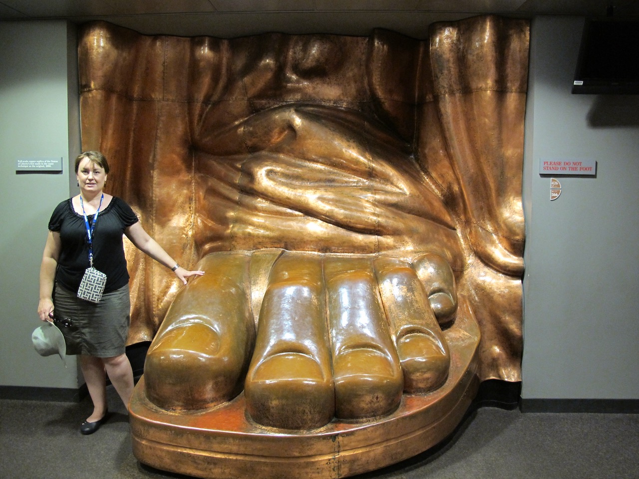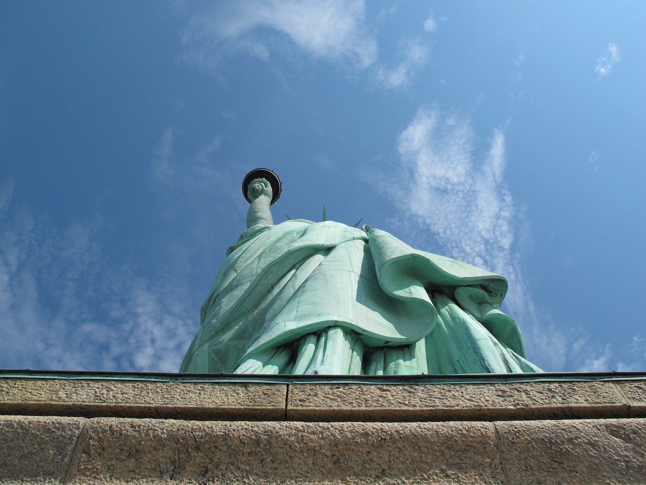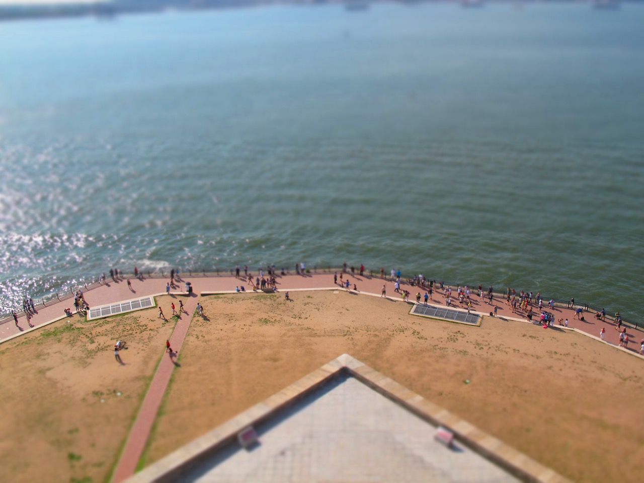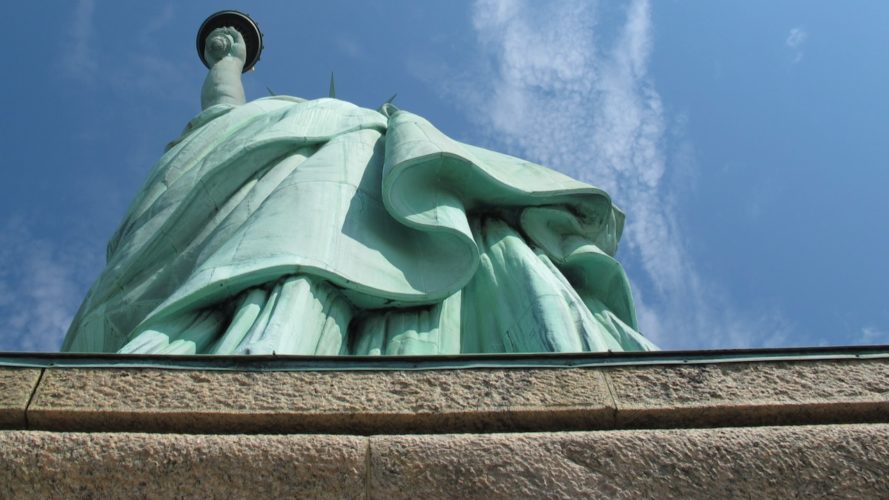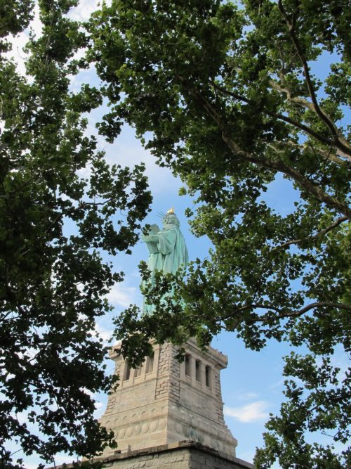 As we approach the monument the pedestal looms large with Lady Liberty towering above us. We wander through the shadow the statue casts, a reprieve from the heat for a minute as we gaze up. We circumnavigate the pedestal before entering the base of the monument and making our way up. We’ve purchased tickets to go inside and up, but not to the flame. As we enter and begin our climb, the heat hits us. Inside this metal tower it must be 120F degrees. We trudge ever upward, hoping for relief at some point. Our water was confiscated, so we don’t even have a drink as we ascend. We eventually make it to the viewing platform about two thirds of the way up and gasp for air as we peer out from the tiny viewing platform.