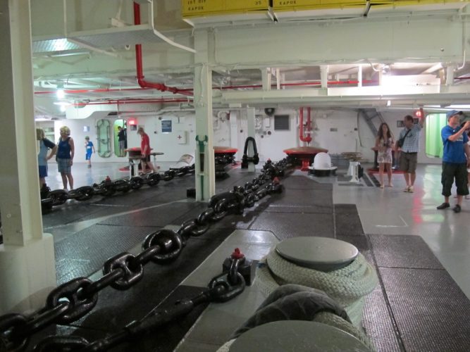 More interesting to us than the war machines of the past is the Concorde, which is also on deck. We wander its slender length, its bizarre shaped and moveable nose sector before entering the tight space. As part of our tour we hear about stories of Princes Diana and Prince Charles sitting in the front row as they jetted from New York to London and return. We tour the tight cockpit and learn more about the Concorde program and why ultimately cost, not tragedy, forced the cancellation of this modern miracle of the skies.