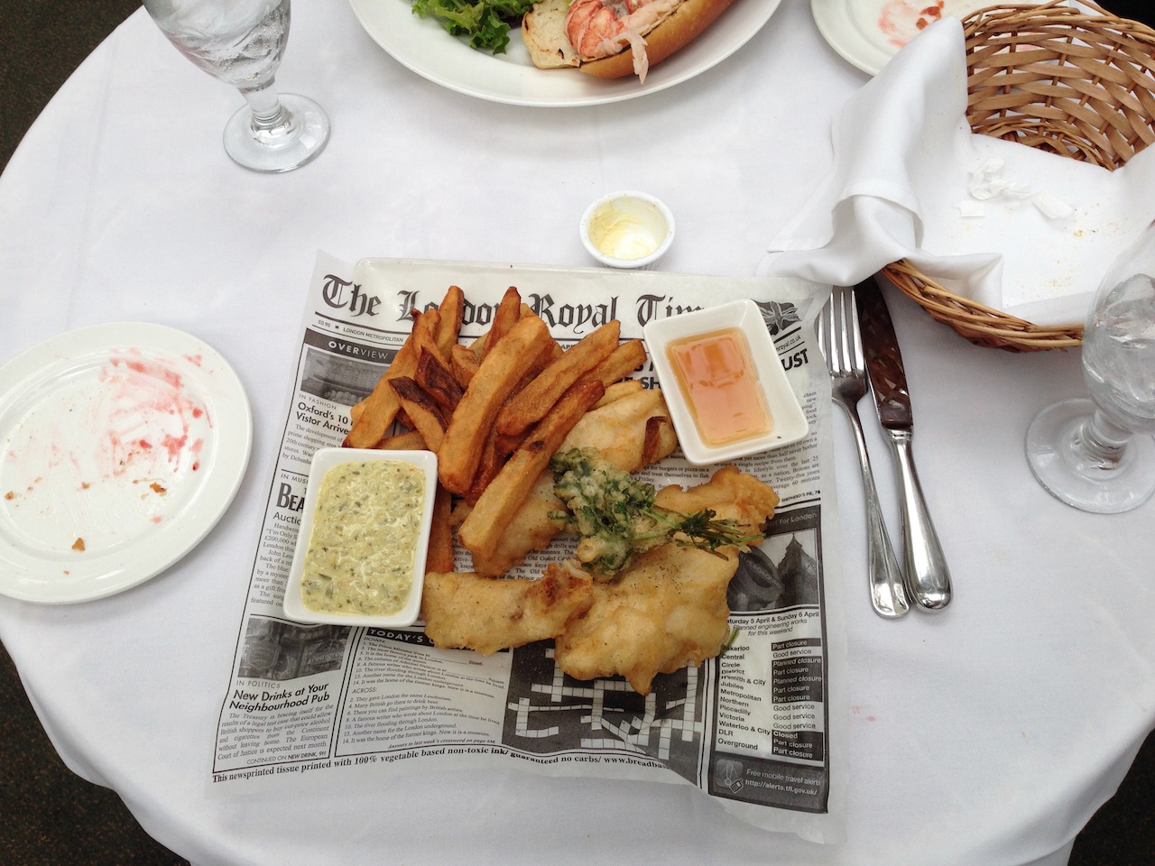 We head out for lunch in the early afternoon and go to the Bryant Street Grill. It is a restaurant located at the rear of the library, which backs onto Bryant Park. We enjoy fish and chips and a lobster roll. My fish and chips are served on what appears to be a newspaper, mimicking the way fish and chips were served in the old days!