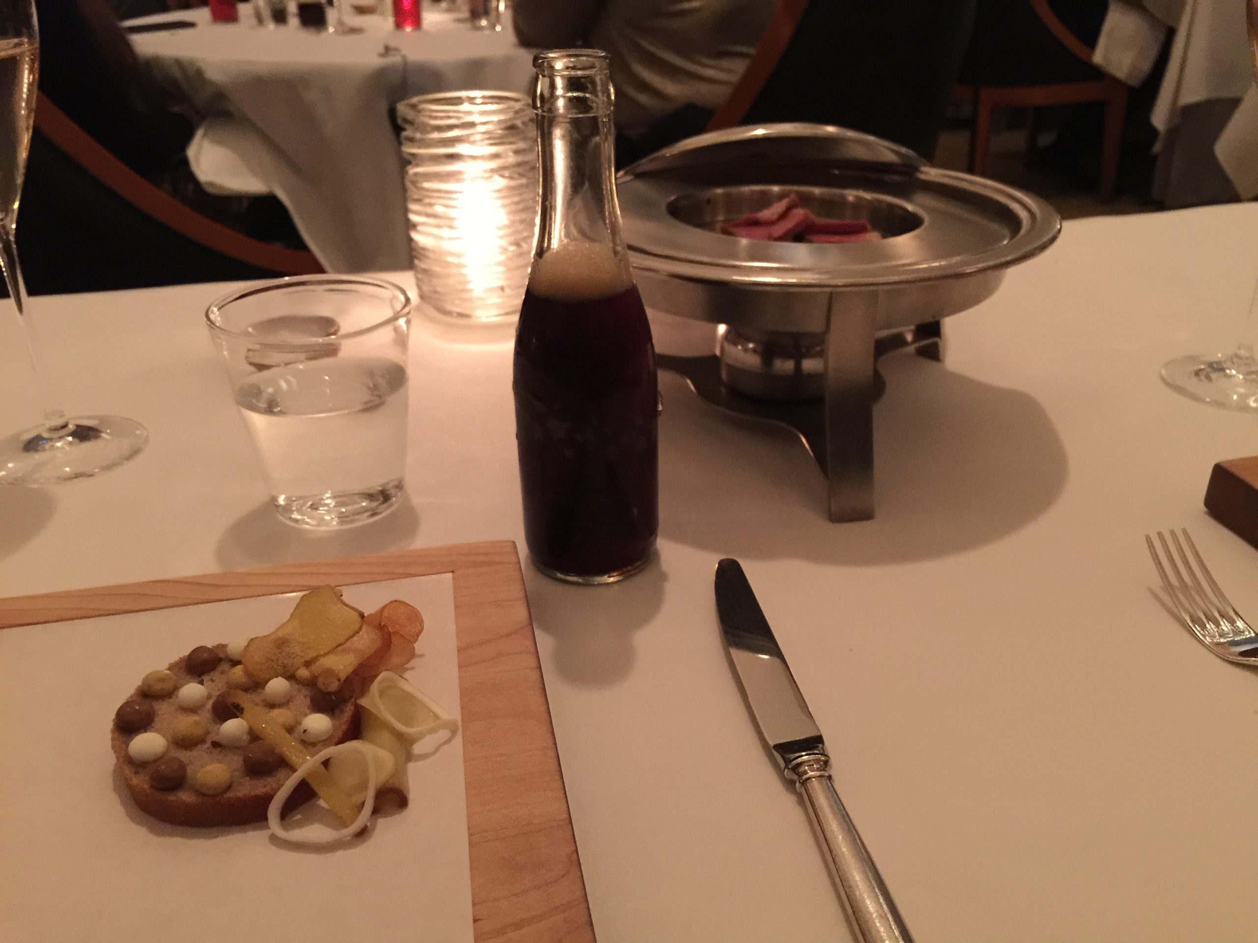 Then we moved into a number of cold entree styled courses. A salad, some seafood and a wonderful homage to the NYC delicatessen. The pastrami sandwich, so often seem as a massive sandwich with layers of pastrami and mustard on a fresh bread roll. This version was a petite piece of bread dotted with mustard and garlic and two exquisite pieces of pastrami in a heated pan. Added to this dish was a freshly made bottle of soda in an old style bottle matched to our originl choice. Mine was maple juice and Mardi’s cranberry flavoured. Yum.