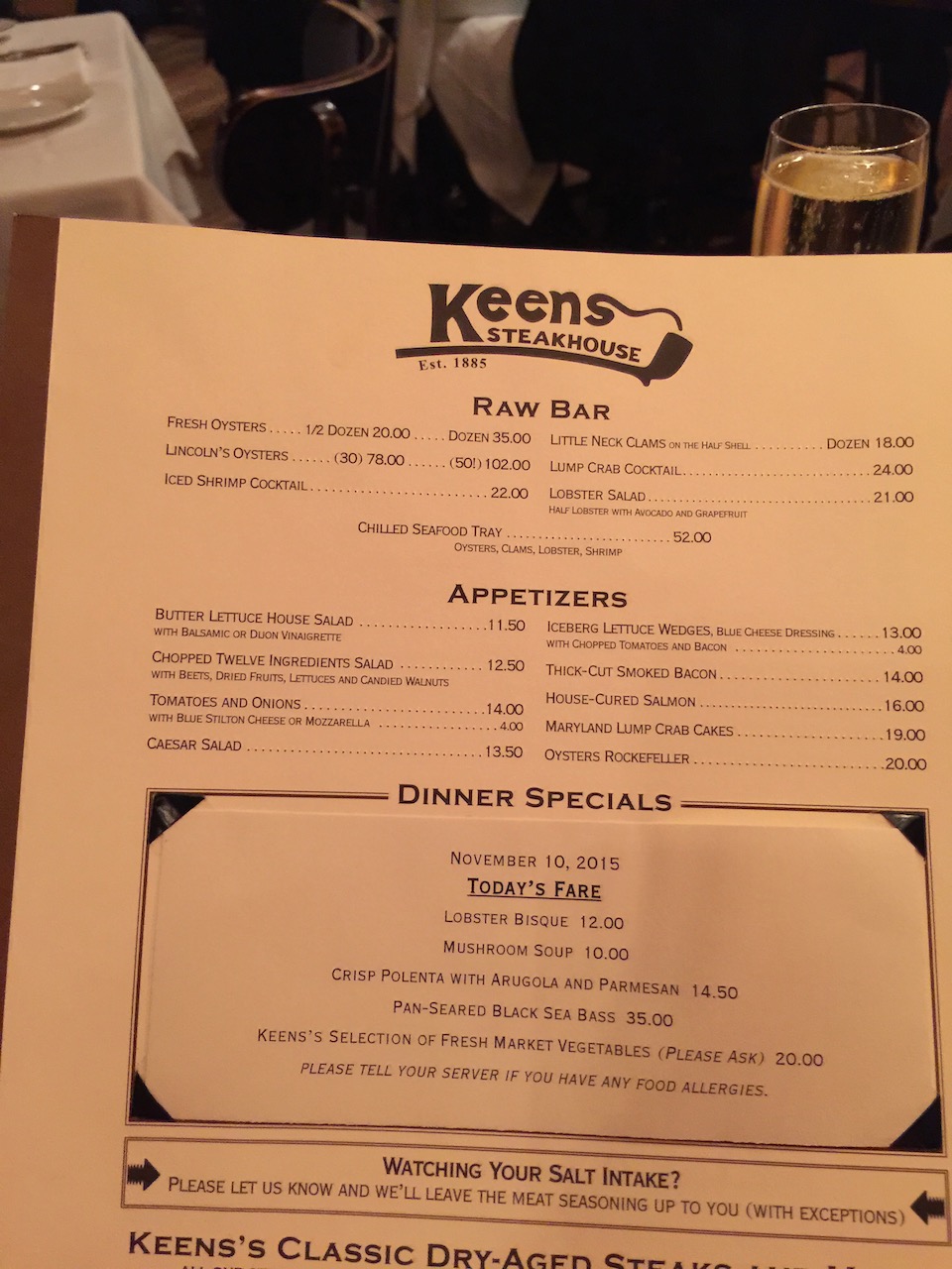 We decided to go out for dinner to our favorite steak place in NYC, Keens. It was only ten minutes from our hotel, an easy walk and the restaurant is always dark, which was great for my eye.