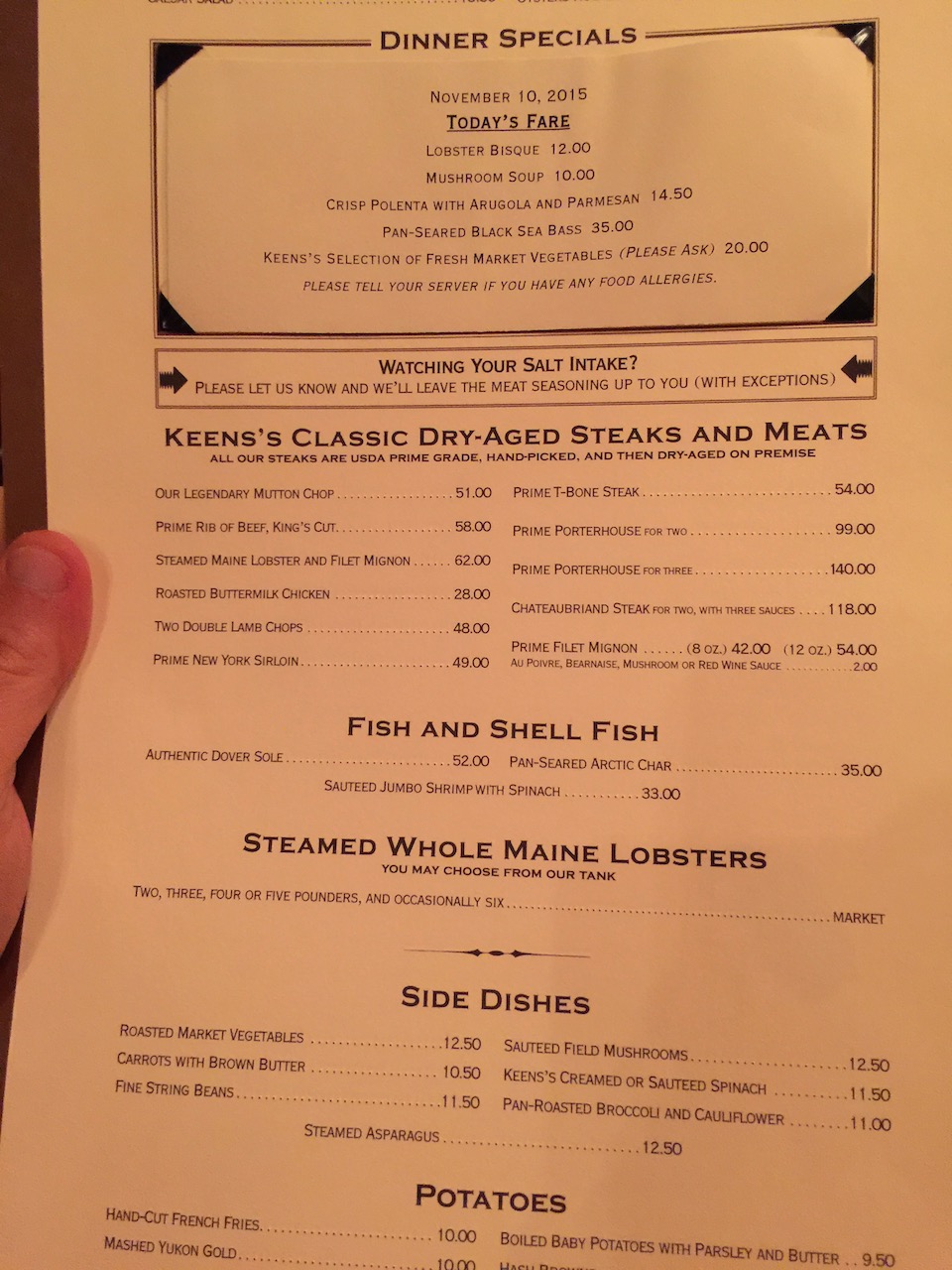 We both enjoyed a perfect steak in the unique surroundings. The ceiling is lined with pipes and the walls are covered with photos and paintings from years gone by. Keens used to be a smoking establishment for New York gentleman. They’d store their pipes at the venue and gather in the evenings to drink whiskey and smoke. Check some more history here : http://ny.eater.com/2011/7/27/6670601/the-history-of-keens-the-126-year-old-house-of-mutton#4288578