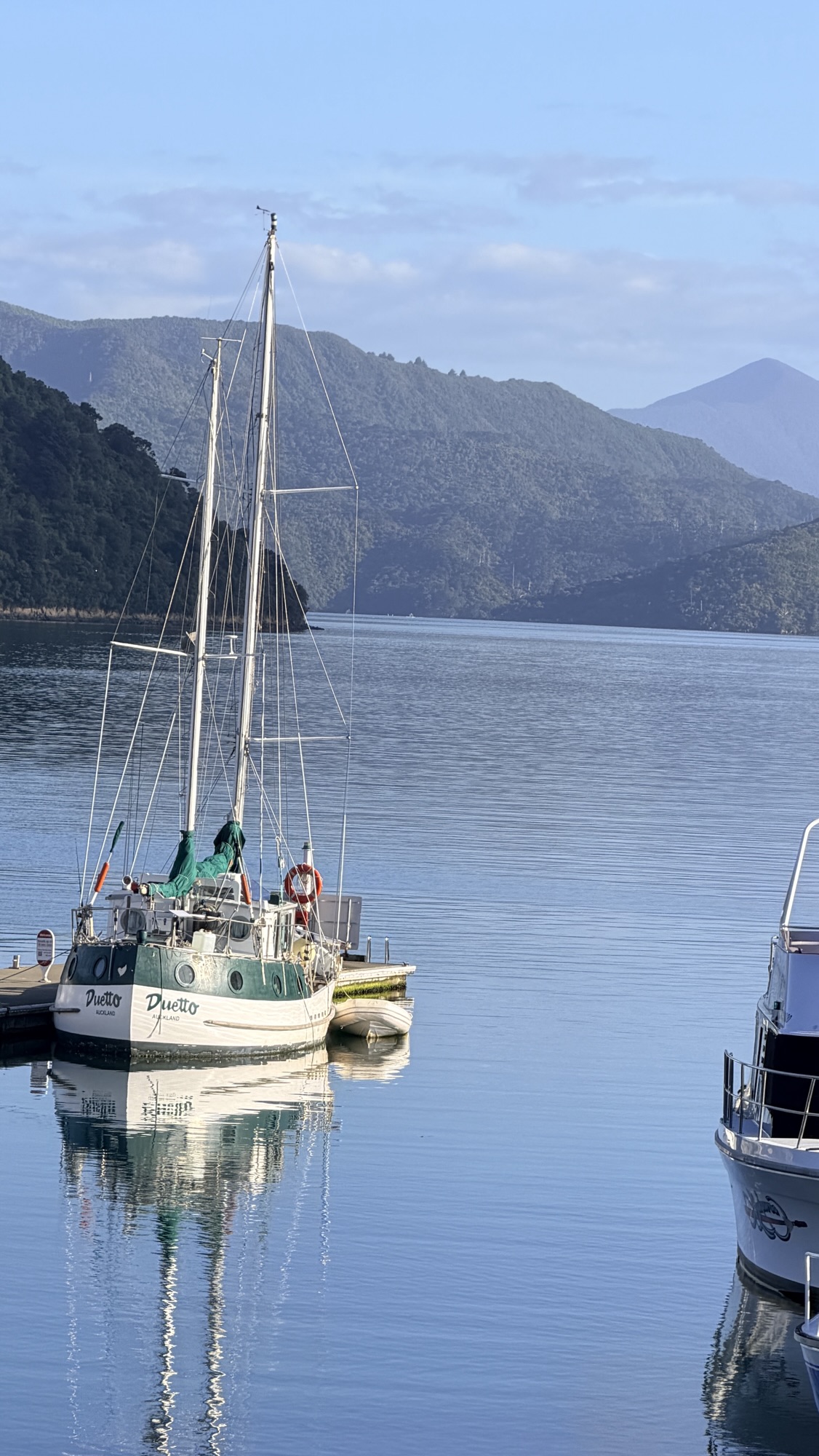 We were up early at 6.00am and had breakfast straight away. Our excursion was booked for 8.00am, but the ship didn’t dock until 7.00am, so we wanted to be ready to disembark as soon as possible. The tour was with E-Ko Tours, a local operator specialising in small-group eco and wildlife experiences in the Marlborough Sounds. The focus for the morning was marine wildlife, particularly birds and dolphins, along with a visit to a lookout in Queen Charlotte Sound.