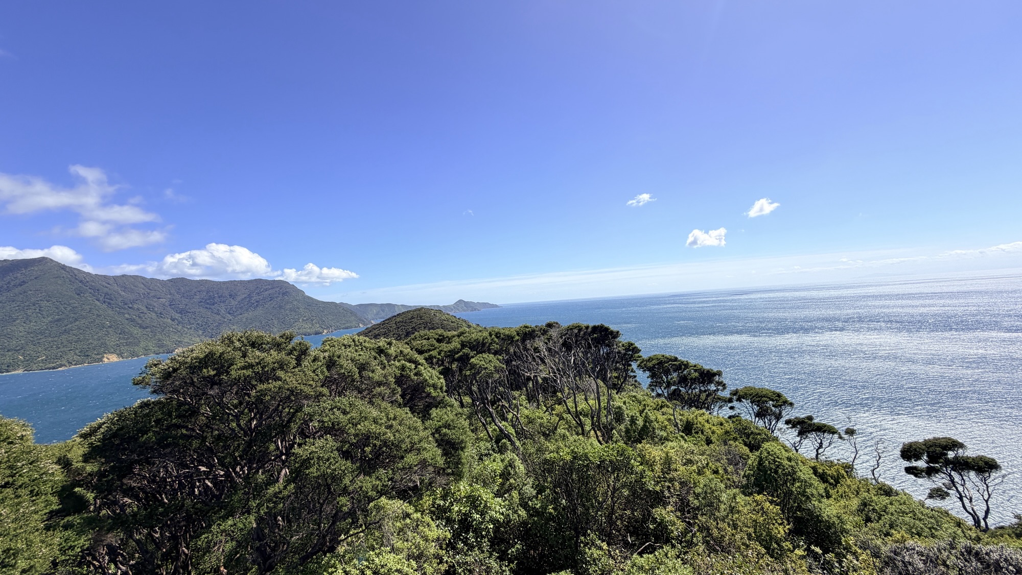 Birdlife was everywhere, particularly along the rocky shoreline and in the trees above. With Mardi’s help, and using my camera’s zoom, I managed to get some clear shots. The standout bird we saw was the King Shag, one of New Zealand’s rarest birds and found only in the Marlborough Sounds. The photos show a large, black-and-white shag perched on the rocks, identifiable by its size, colouring and the distinctive blue band on its leg, part of conservation tracking efforts. We also saw Australasian gannets, elegant and unmistakable with their long wings and pale colouring, along with fluttering shearwaters skimming low over the water. Red-billed gulls were common around the port and coastline, their sharp calls carrying across the wind.