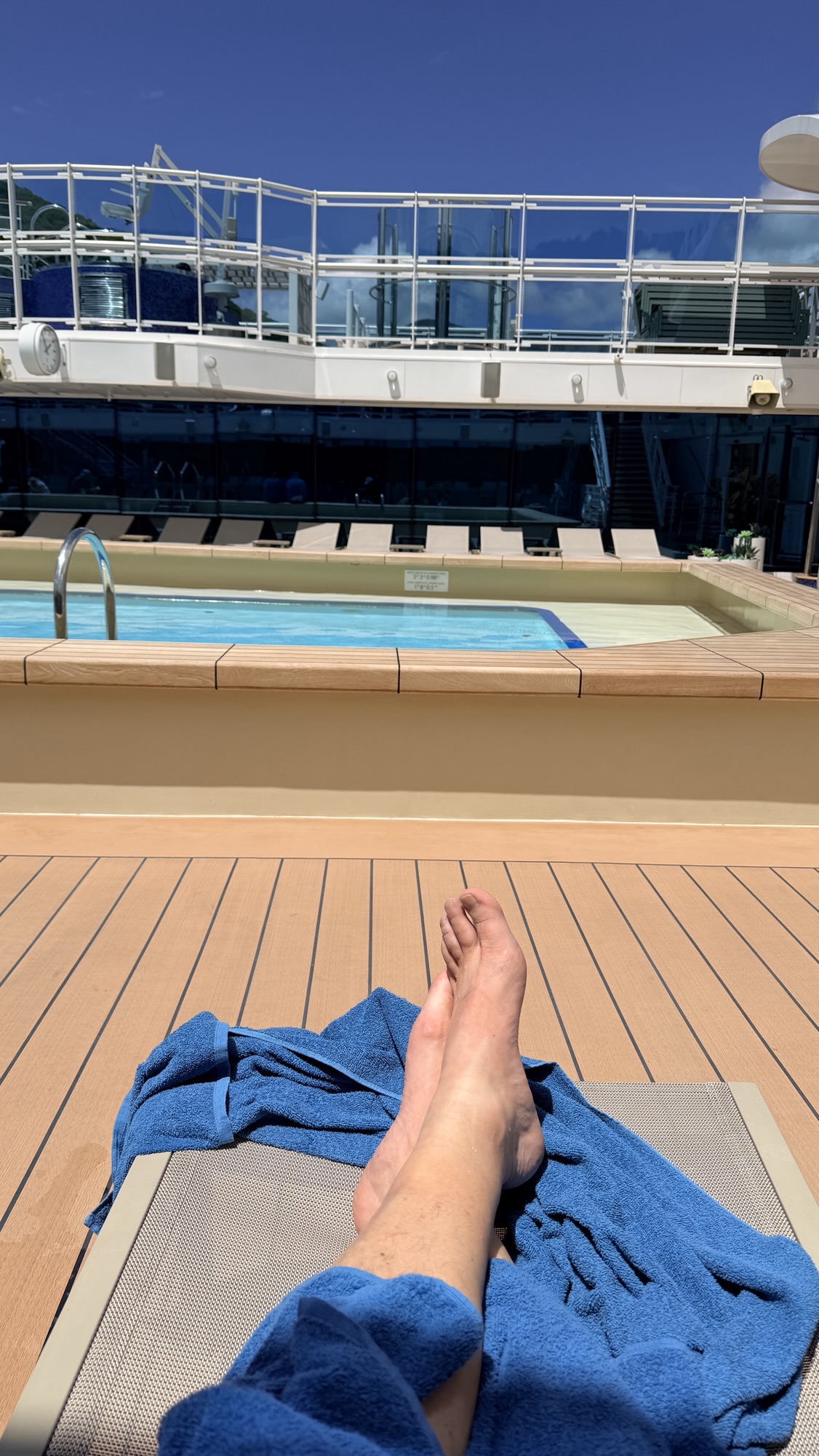 Before heading to the adults-only pool area, we grabbed a quick lunch at Gigi’s Pizzeria onboard. After that, we made our way to The Retreat, the adults-only pool deck. Adults-only here simply means no kids rather than anything more exotic. I had a swim and did a few gentle laps while Mardi settled in with a book. After the rough morning on the water, it was exactly what we needed.