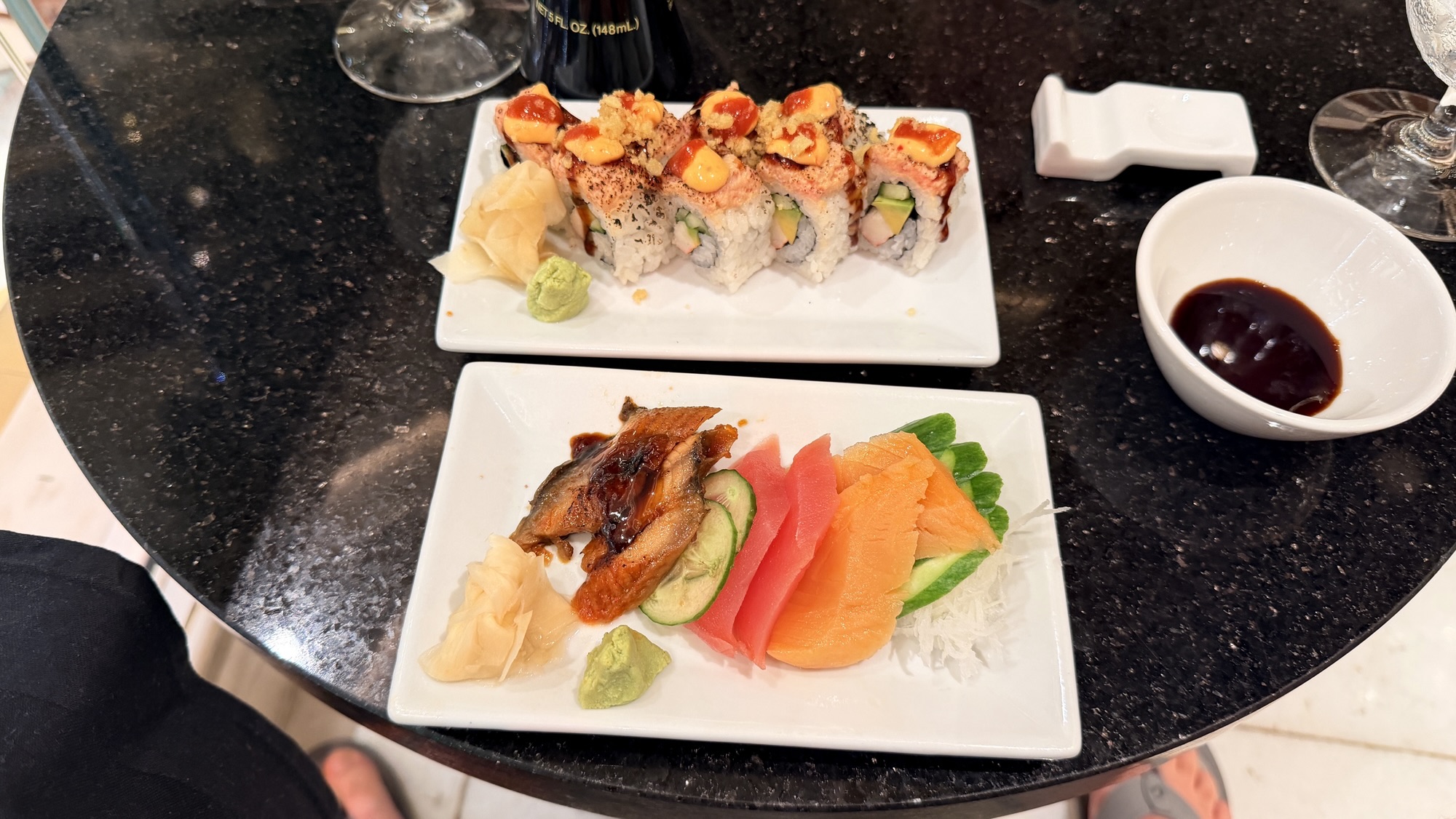 Dinner tonight was our final meal onboard, and we chose the sushi bar. There was a real end-of-cruise atmosphere throughout the ship. As we sat eating, a live band was playing in the Piazza below, performing well-known songs from the 80s and 90s. Sitting directly above them, we could see the keyboard player, drummer, backing vocalists and lead singer. It created a great vibe and felt like a fitting soundtrack for the final night.