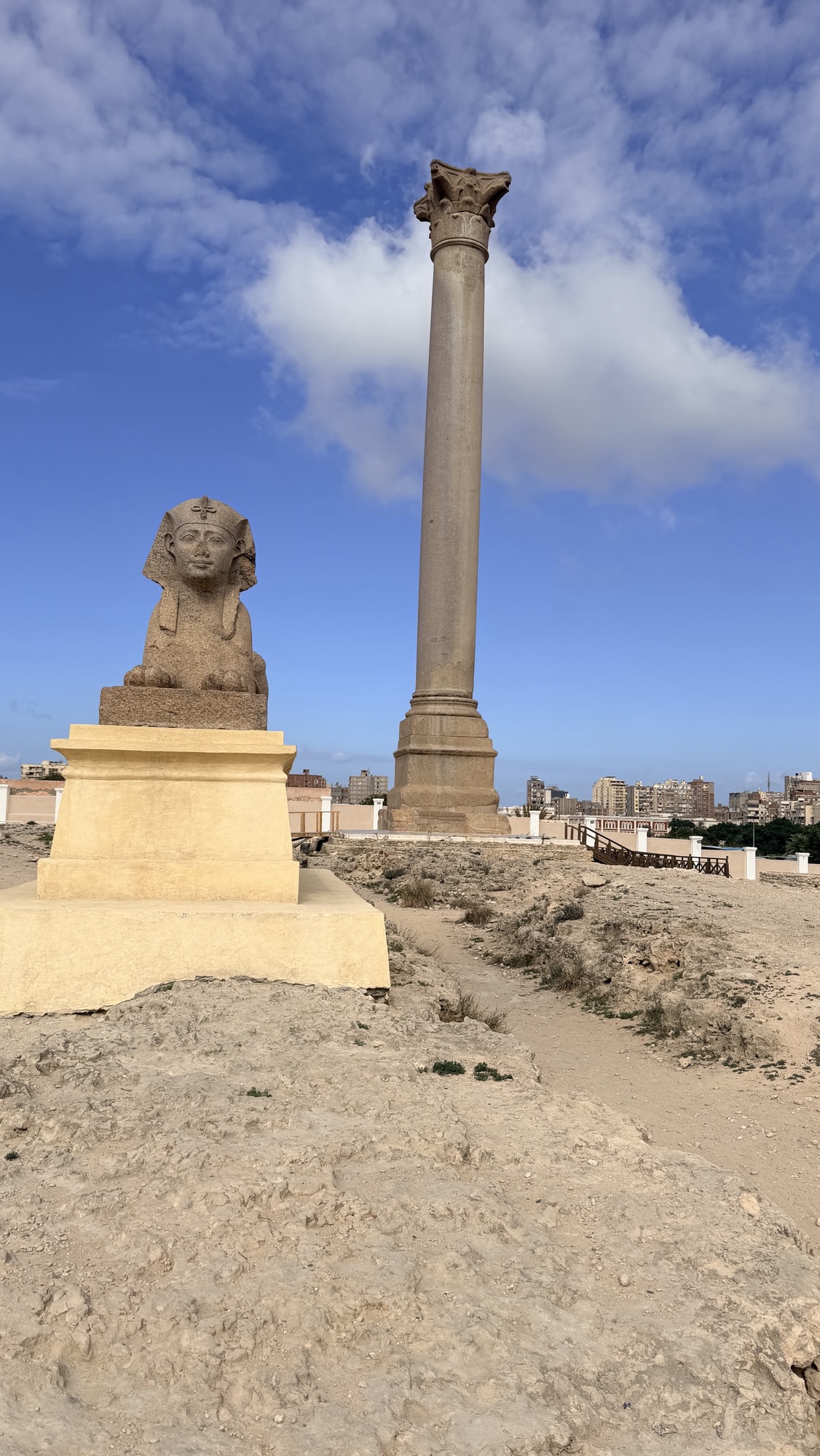Nearby stands a sphinx, again reinforcing how Alexandria constantly blends Egyptian forms with Roman ideas.