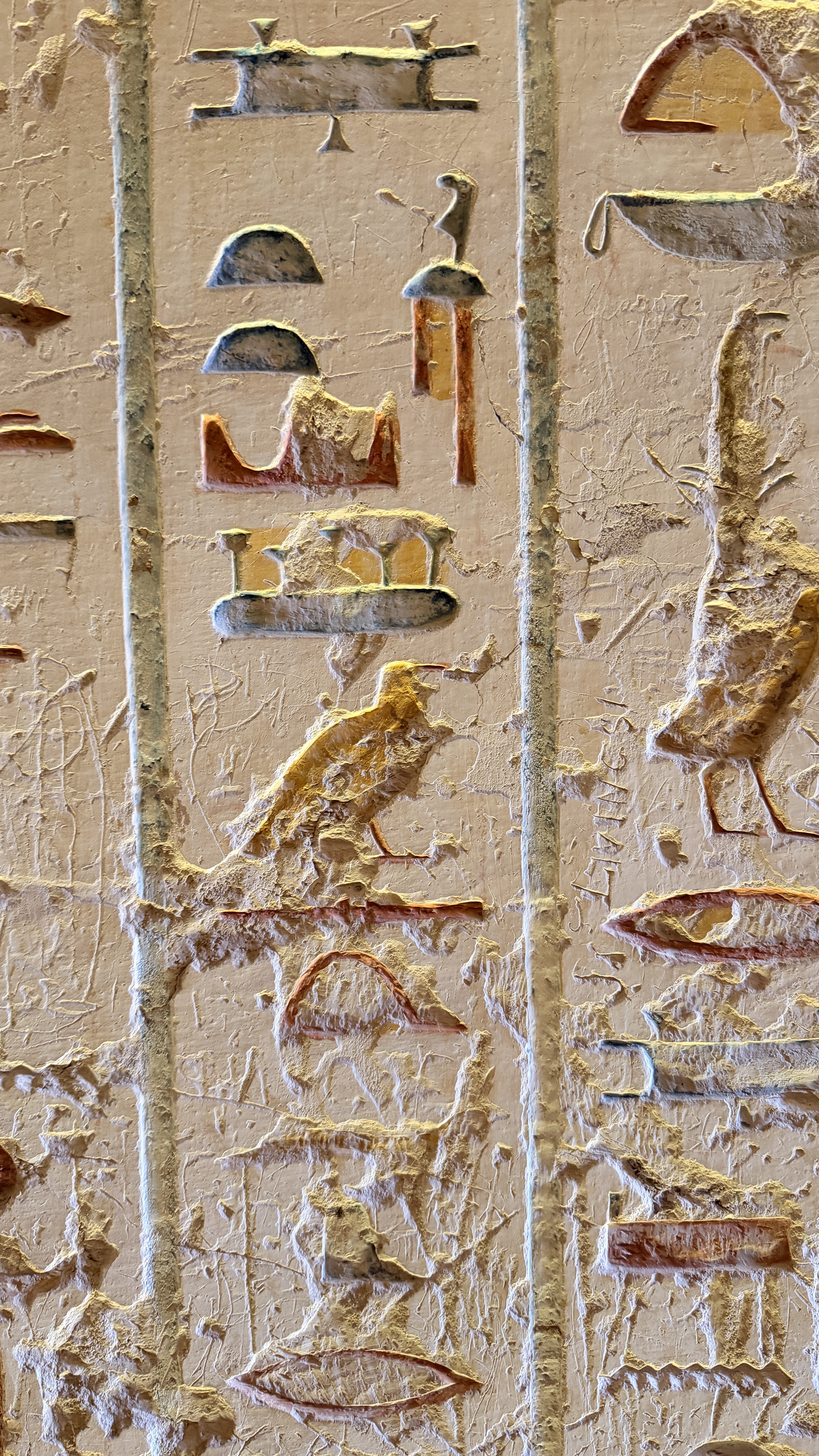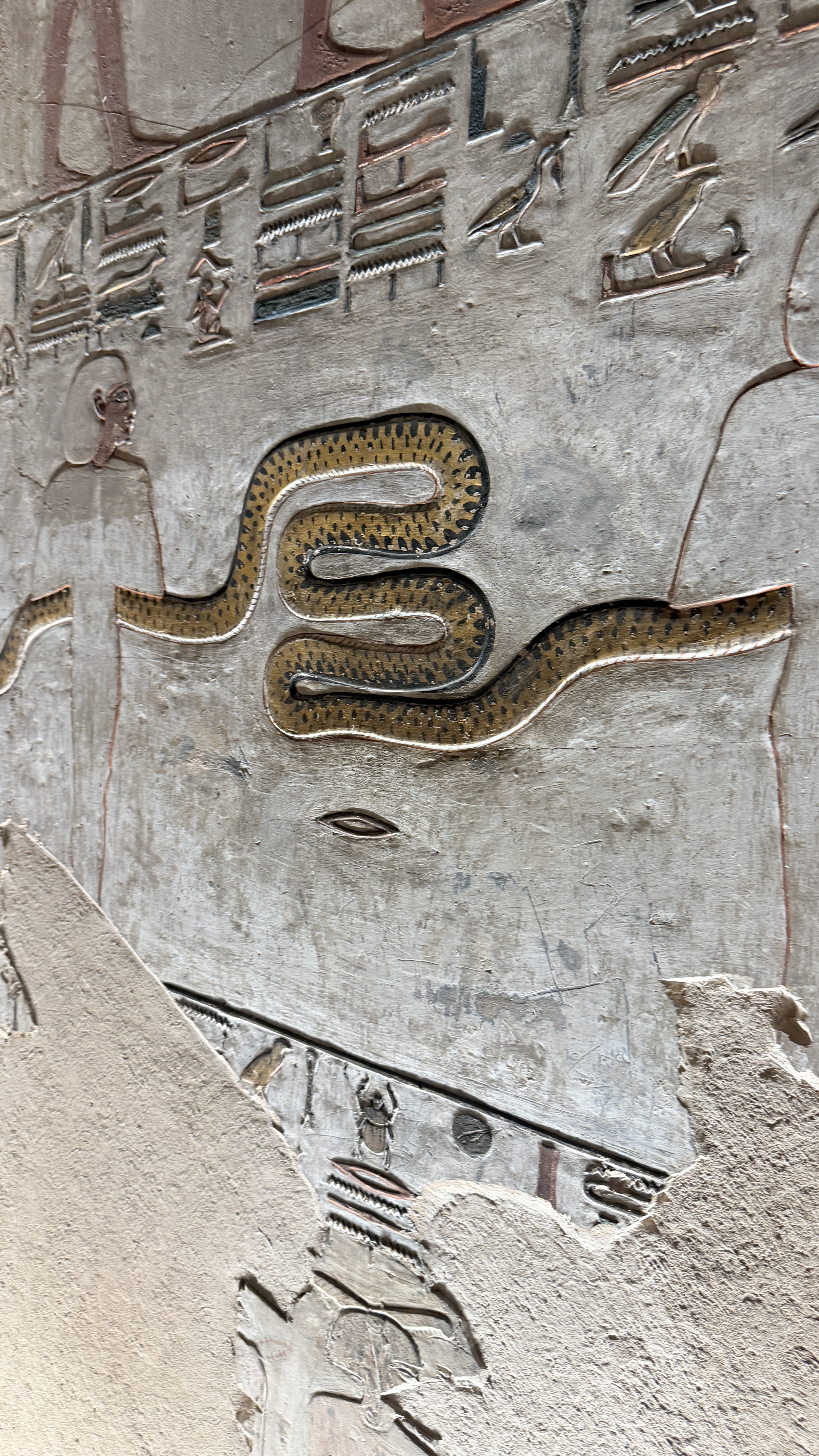 The descent is long and steep. Around 45 degrees at first, then continuing deeper and deeper. This tomb had time. Resources. Care. The walls are carved, not painted, then filled with rich colour. The scenes are elaborate, layered, and precise.
