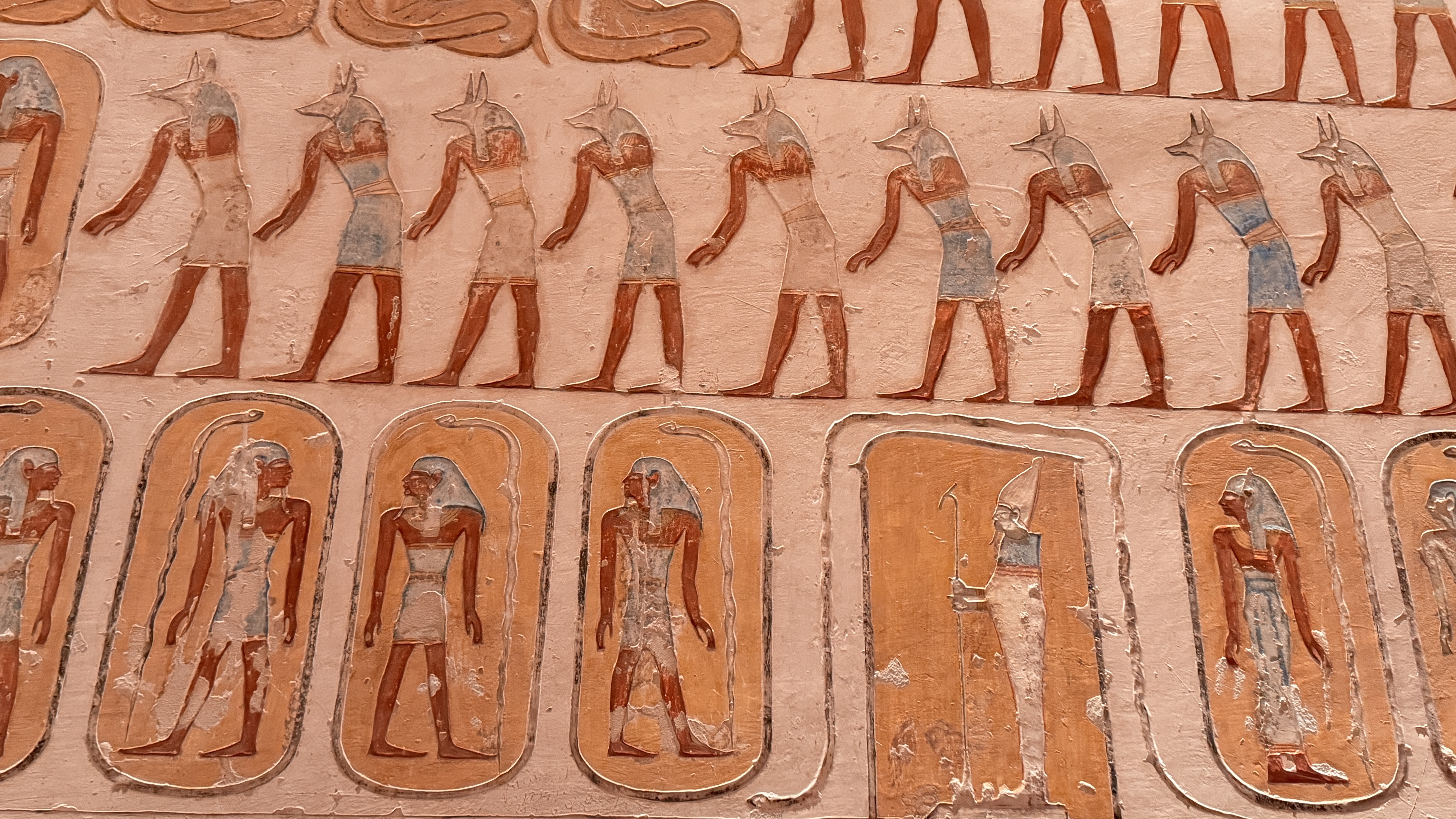 Every surface is covered. Walls. Ceilings. Columns. Vivid paintings depicting the afterlife: gods with animal heads, serpents, owls, crocodiles, three-headed creatures, and scenes of daily life interwoven with cosmic journeys. Boats crossing the underworld. Deities guiding the king.