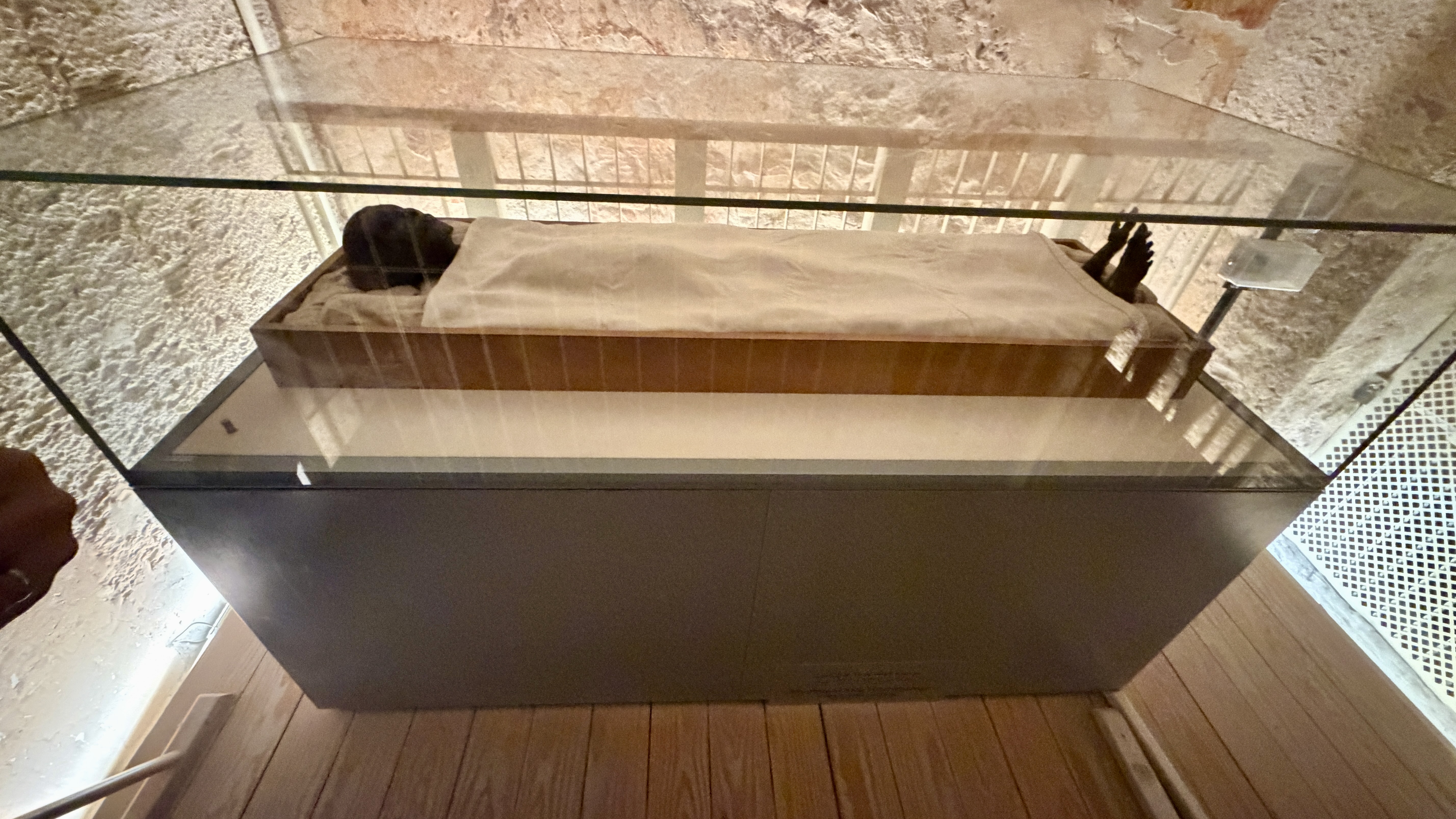 Inside, there are two main chambers. To the right is the sarcophagus. To the left, the king lies in state. His mummy is visible. Small. Withered. Over 3,300 years old. Wrapped from neck to ankles, but his face, hair, feet, toes, and toenails clearly visible.