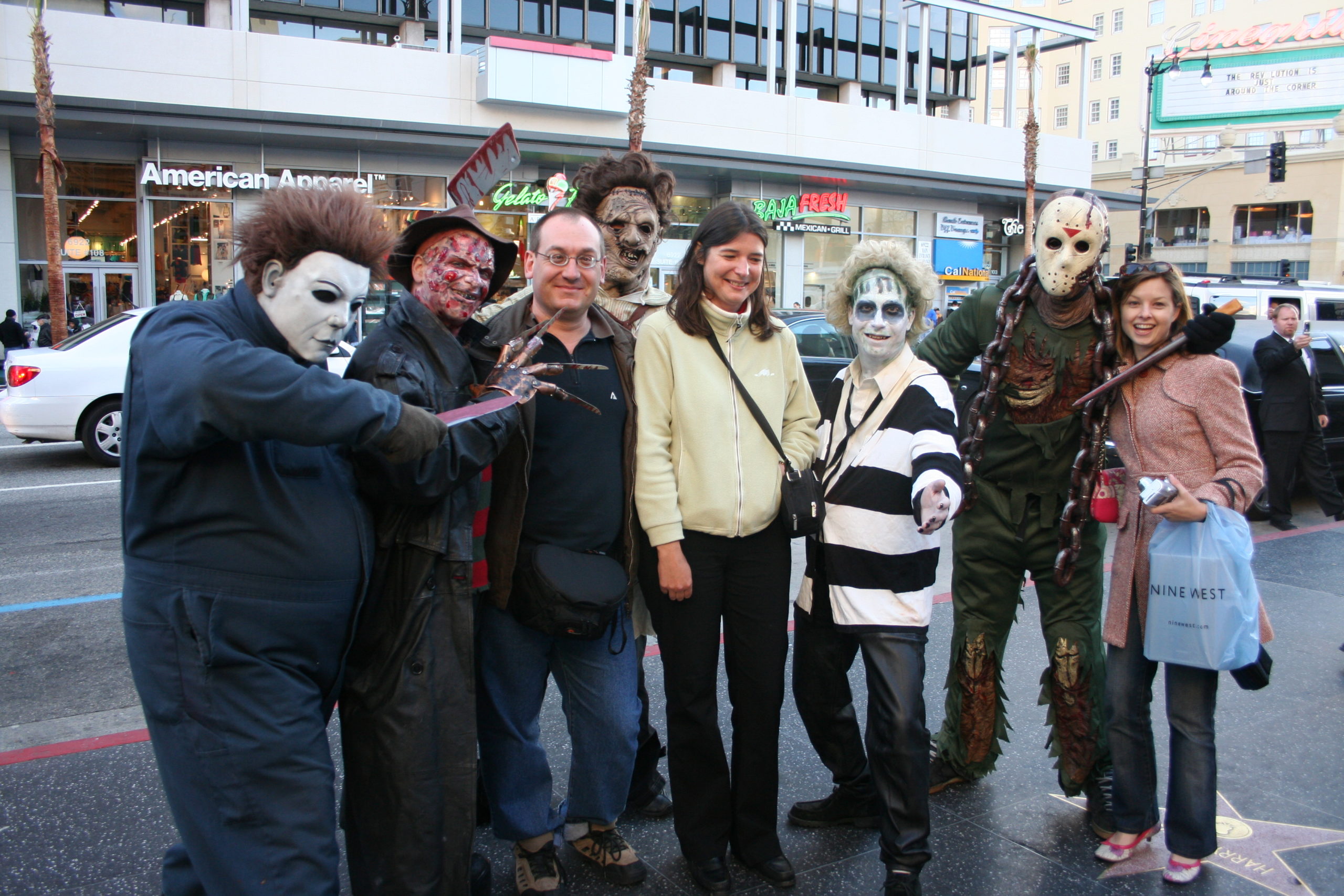 The street was lined with look a like movie characters. We happened across a group of villains: Freddy Kruger, Jason, and a few other weird looking characters.